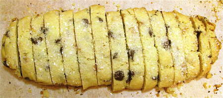 ...or crosswise. Crosswise, you'll get slightly shorter cookies, and slightly more of them. Be sure to cut straight up and down, so the mandelbrot can stand on their edges without wobbling.