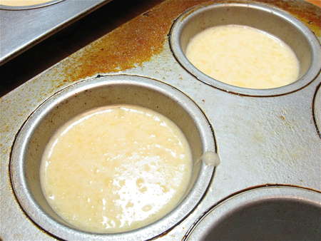 Grease a standard muffin tin. By standard, I mean one whose cups are close to 2 1/2” wide and 1 1/2” deep. If you use a pan with smaller wells, you can fill them a bit fuller, but don't fill them all the way to the rim. And be sure to grease not only the cups, but the surface around them as well. The popovers are going to balloon up and over the edges of the wells.