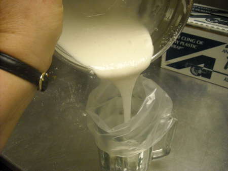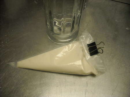 Here’s one of my favorite hints: since you really need three hands to fill one of these, try putting the bag inside a tall narrow container with a heavy base, like a vase or a beer mug. Then you can have both hands available to encourage the icing into the bag.