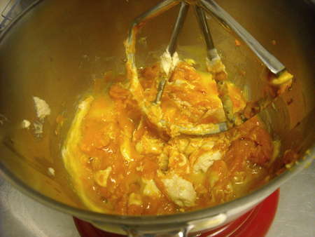 Cream the butter and sugar, scrape, then in go the pumpkin, eggs, and flavorings. The orange zest is optional; if you 're baking for kids who might not be up for that kind of taste combination, by all means leave it out.