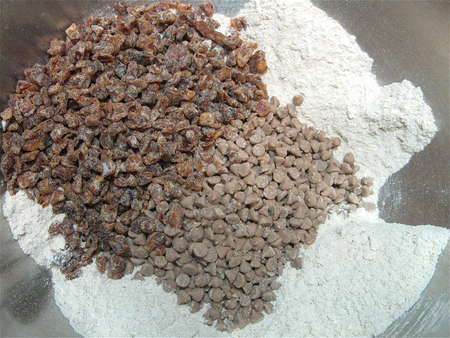 So, whisk together the flour, oats, sugar, salt, and baking powder, plus cinnamon, if it goes with your add-ins. And I can think of very few add-ins cinnamon doesn't complement. Stir in about 1 1/2 cups chips (cinnamon, chocolate, cappuccino...), nuts, and/or dried fruit.
