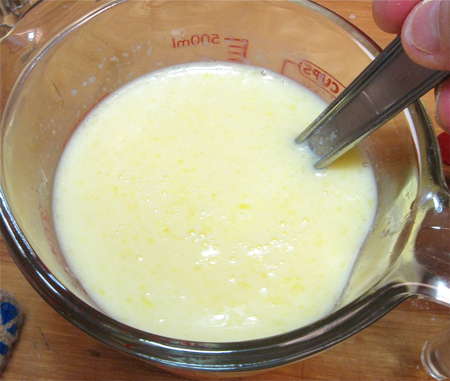 Next, combine the milk, vanilla, melted butter (or oil), and eggs. Whisk or beat with a fork till no streaks of egg show.