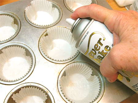 I like to line my muffin tin with papers. Why? Because I don't mind doing dishes, but I definitely grumble over having to scrub out all those hard-to-reach little creases in a dozen muffin cups. Spare me—which is exactly what muffin cups do. I grease them with our trusty Everbake spray, to make sure they slip off the baked muffins without any crumbling, and there you have it—slicker ’n a smelt, as they say in Maine.