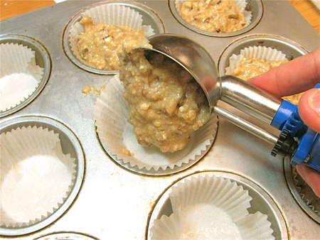 Use a 1/4 cup measure (or muffin scoop, or big ice cream scoop) to portion batter into the muffin tin.