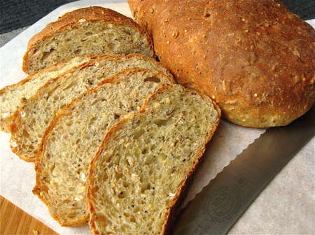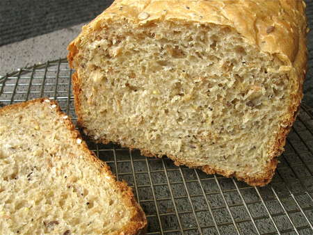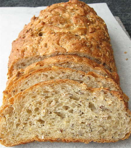 Note the lovely open texture and the nubbly look of seeds and whole grains. This bread's a looker, for sure—AND it tastes good.