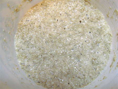 Next day, you'll see that the starter has risen and become bubbly, though not with the vigor of a white flour starter. It's OK; the yeast is just as happy (happier, actually) growing in whole wheat as white flour. It's just that the whole wheat doesn't capture as much of the yeast's CO2 as white flour does.