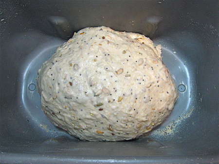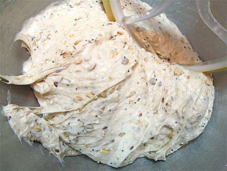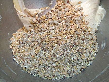 Five minutes later, the grains are nicely kneaded in.