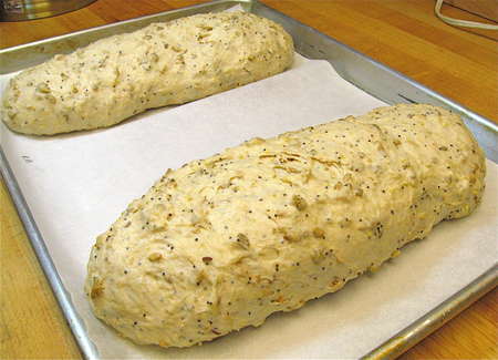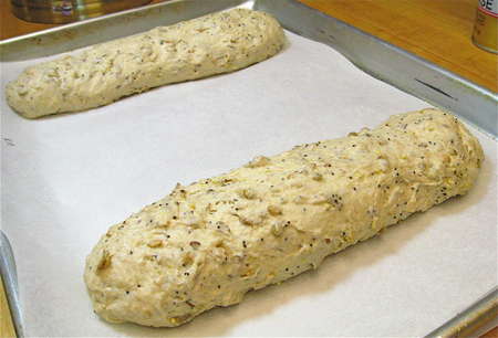 Divide the dough in half, and shape each half into a 10” log. Place the logs on a lightly greased or parchment-lined baking sheet, leaving plenty of space between them. Cover and let rise for 60 to 90 minutes.