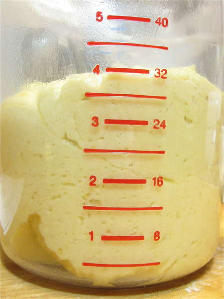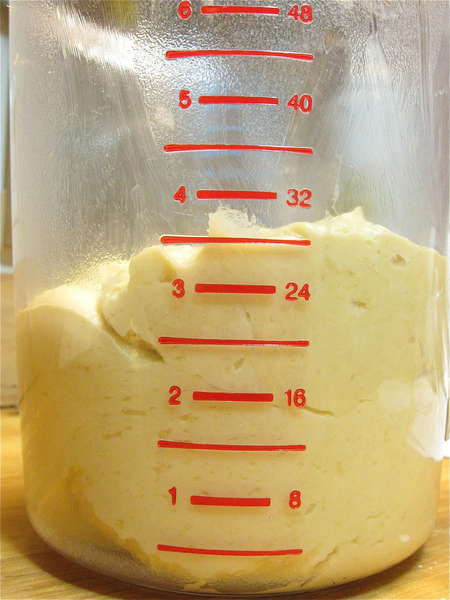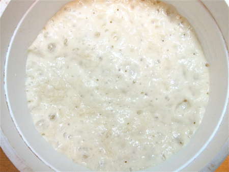 Fourteen or so hours later (basically, from late afternoon to early the next morning), the starter has bubbled up and become much softer. That's the yeast, growing and giving off CO2, alcohol, and organic acids.
