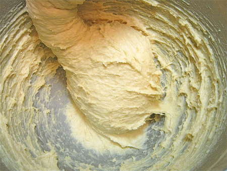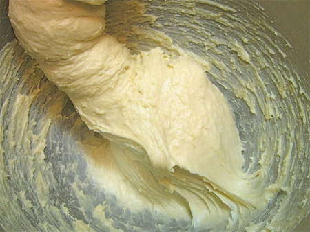 Then knead with a dough hook. Notice that this is a pretty sticky dough; it won't quite clear the sides of the bowl on its own.