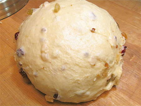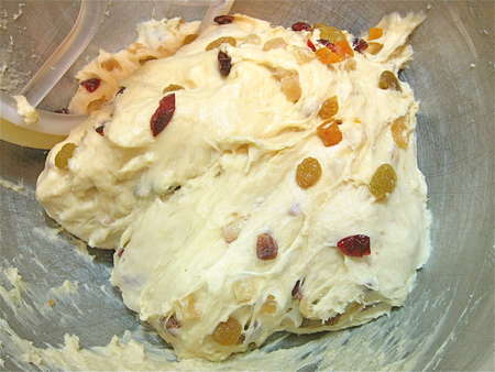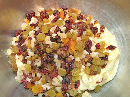 Once the dough has risen, gently deflate it and knead in the dried fruit. I'm using dried cranberries, pineapple, apricot, and golden raisins.