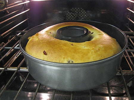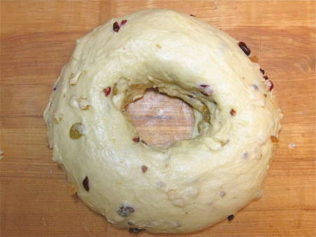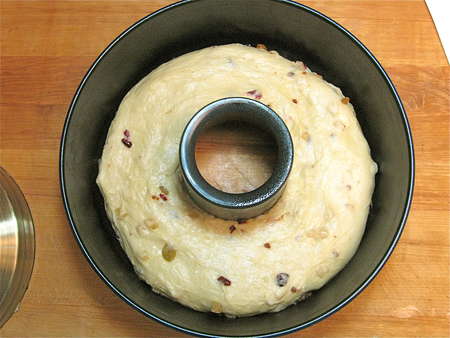 Hey, what's with the hole?! I find that baking the panettone in its traditional tall, round shape is problematic. The outside inevitably becomes dry and overly browned before the inside is totally baked. Solution?