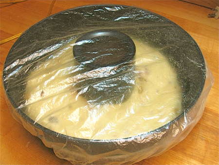 Cover with plastic wrap. Or a throwaway shower cap from a hotel—that's what I'm using here. I ask all of the traveling folks at King Arthur to bring me back shower caps; they get a good workout in the kitchen. (The caps, not the travelers...)