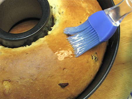 Remove from the oven. While it's still warm, brush the crust with melted butter; a silicone brush does a gentle, thorough job. Again, not traditional—but definitely American. From corn-on-the-cob to pancakes to cinnamon bread, what do we NOT like to gild with melted butter?