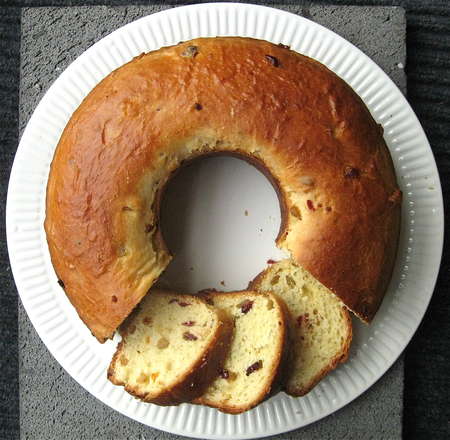 Remove the panettone from the pan. If your audience is very traditional, serve sliced, so they don't see you've baked it in—horrors!—a tube pan.