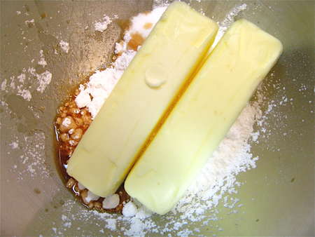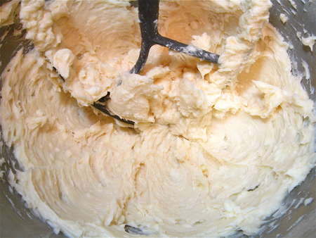First, beat together the butter, sugar, and vanilla; a touch of almond extract is welcome, too.