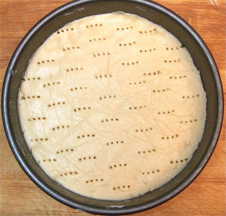 Remove the plastic wrap, and prick the dough all over with a fork; this will prevent it from bubbling as it bakes.