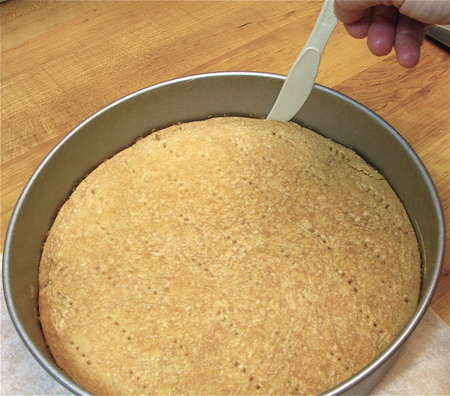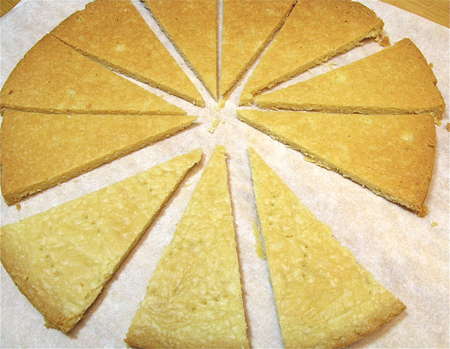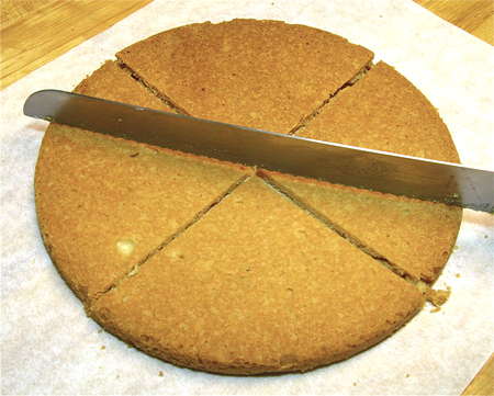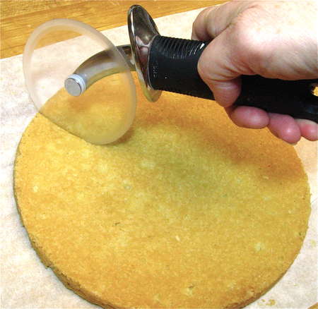 ...or with a rolling pizza wheel. Be sure to do this while the shortbread is warm; as it cools it becomes crisp, and cutting crumb-free, intact wedges becomes more of a challenge.