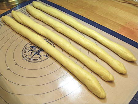 Remove the dough from the bread machine. We're going to make a four-strand braid here, so divide dough into four pieces, shaping each into a rough log on a lightly greased silicone mat (or other clean surface). If you want to make a simple three-strand braid, divide the dough into three pieces.
