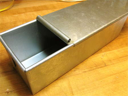 Here's your lidded pain de mie pan. It's a 13” x 4” x 4” pan with a sliding lid.