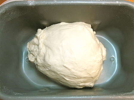 I've put all of the ingredients into the pan of the bread machine, and set if for “dough,” which means the machine will mix, knead the dough, then provide it with a cozy-warm, draft-free rising place for an hour—all with the simple push of a button. This is why the bread machines in our King Arthur test kitchen are such workhorses; they're great for us multi-tasking test bakers, who can't afford to spend too long on any one project. Push a button and walk away? Works for us.