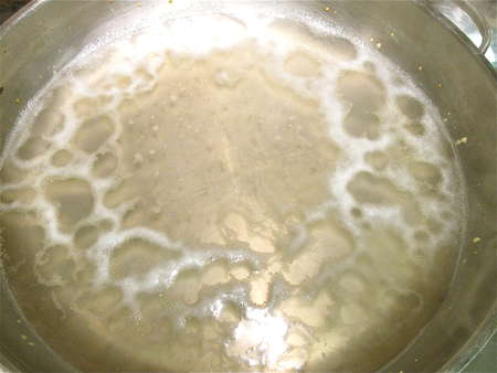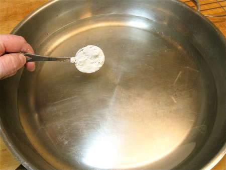 Heat about 1” of water in a large, flat skillet; this one is about 12 3/4” diameter. Add a tablespoon of non-diastatic malt powder; this will give the bagels their distinctive shine. Substitute brown sugar if you like; it won't be quite the same, but it'll work.