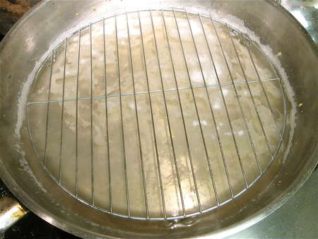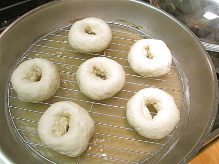 Place the six bagels on the rack over the gently boiling water, and cover.