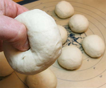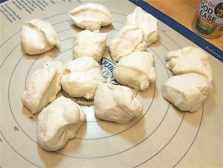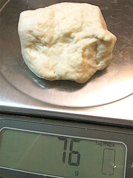 Divide the dough into 12 pieces; a scale makes this easy. Each piece will weigh between 2 1/2 and 2 3/4 ounces, or 76g.