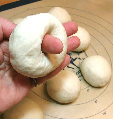 Twirl each bagel on your finger to widen the hole to about 1 1/2” diameter.