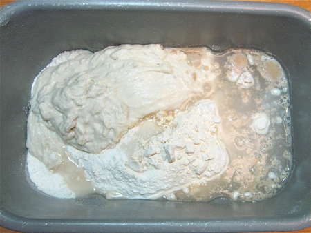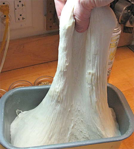 I'm going to make this dough in the bread machine, as it does such a good job developing Lancelot's abundance of stretchy gluten. A stand mixer is also fine. It's really difficult to fully develop dough made of high-gluten flour by hand-kneading, so if you're not an expert kneader with lots of energy, resort to a machine, please, for best results.