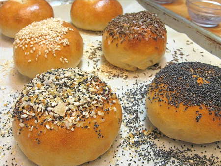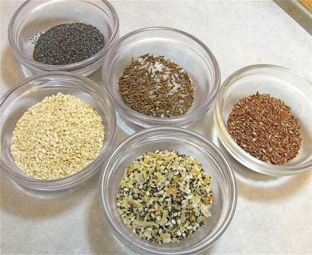 While the bagels are baking, get your seeds ready. Here I have (l to r) poppy, toasted sesame, caraway mixed with coarse sea salt, “everything bagel,” and flax.