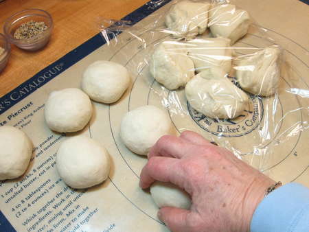 You're going to work with six at a time, so cover half with plastic wrap. Round the other six into smooth balls, rolling them under your gently cupped fingers.