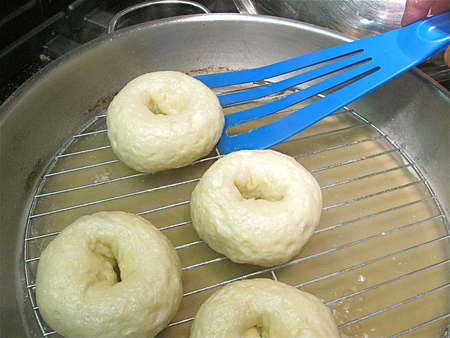 The usual method for making classic bagels involves a boiling water bath. But I've always found it a bit tricky to fish those roiling, boiling bagels out of the water. What do you use? Grab ’em with a set of tongs, they deflate. Poke ’em with a fork—ditto. A spatula works OK, but many's the time I've dropped an unbalanced bagel back into the pot, knocking it into another bagel and splashing boiling water onto the counter (and me). A chopstick works well, if you can manage to get it through the hole and lift without dropping...