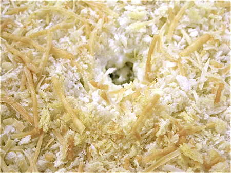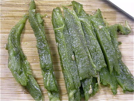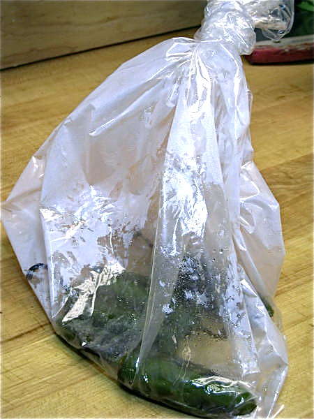 Slice the peppers into long strips, turn the board, and dice. If you're making your dip the next day, refrigerate the peppers in a covered dish, or put them back in the plastic steaming bag and seal it back up. GO WASH YOUR HANDS before you touch anything else!