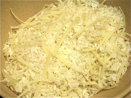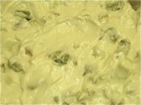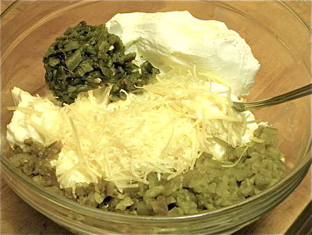 Ah, a classic case of “Do as I say, not as I do.” You'll see in the recipe that you should mix the mayo, cream cheese, and half of the grated Parmesan together BEFORE adding the peppers. What can I say? I forgot, plain and simple. The dip will still mix up just fine, but it's a little harder to be sure you've worked out any lumps of cream cheese. So, do try to remember to mix the cheeses and mayo first.