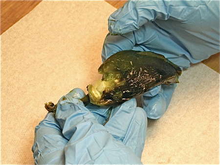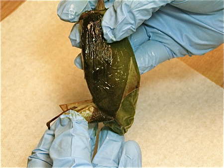If you have sensitive skin, grab a pair of medical gloves for this next part. Grasp the pepper and gently peel the charred skin off. It will come off in strips, depending on how much the pepper split during roasting. You don't have to get every last smidgen, but most of the large pieces.