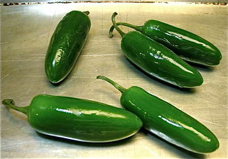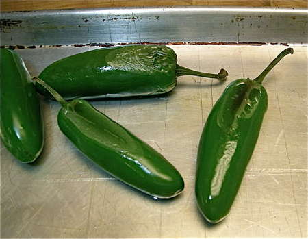 Lightly oil 2 to 5 fresh jalapeño peppers and place on a sturdy baking sheet. Set your oven to broil, and place the rack 6” below the broiler. Place the tray under the broiler. Keep the oven door open a crack to monitor the peppers.