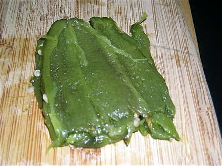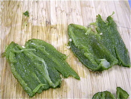 Once the pepper is seeded, place it on a cutting board and flatten out. Repeat with all peppers.