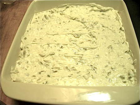 Spread the dip into a 9” x 9” inch cake pan, or 9” pie pan. Be sure the sides are fairly high; handles help with removing from the oven.