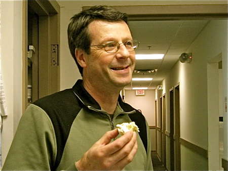 Our employee kitchen was empty when I set out the dip and bread basket, but word spread pretty quickly that the hot popper dip was finally ready.