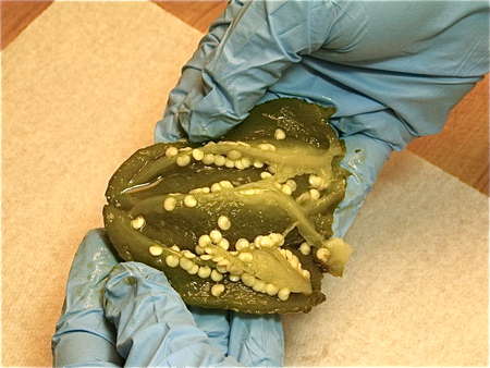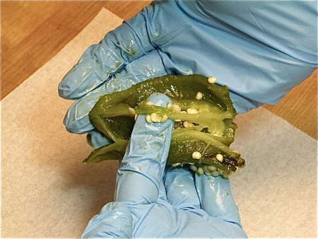 Use your thumb to split the pepper open. This allows you to seed the pepper easily. You can do this by hand as shown, or with a paring knife.