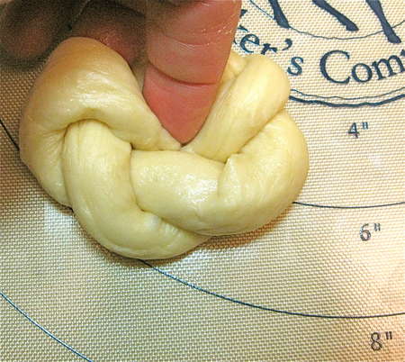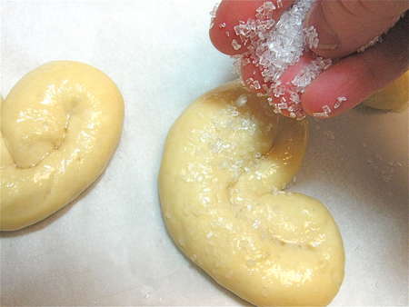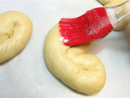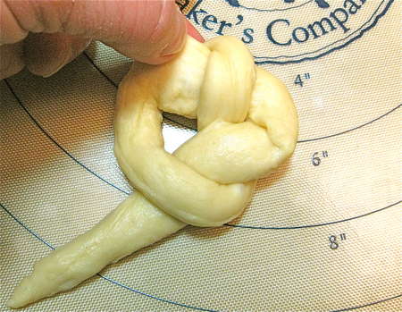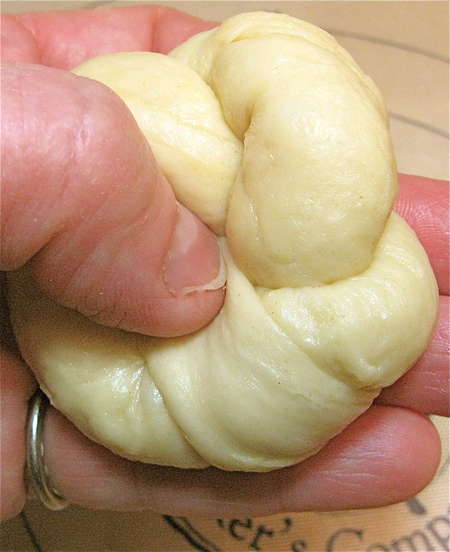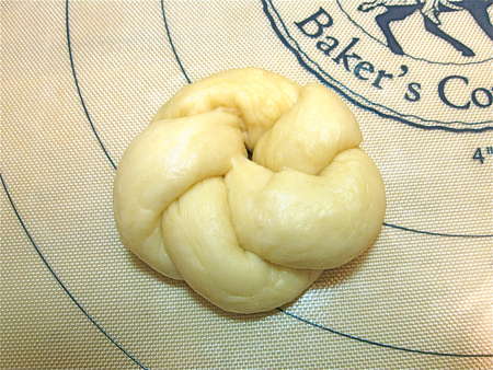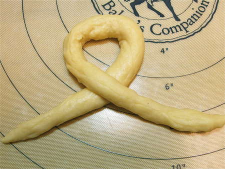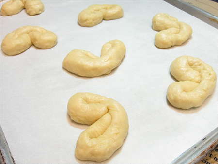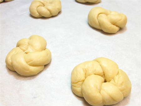 Put the knots on a baking sheet and cover, just like you did the hearts. Let them rise for about 75 to 90 minutes, till they’re puffy.