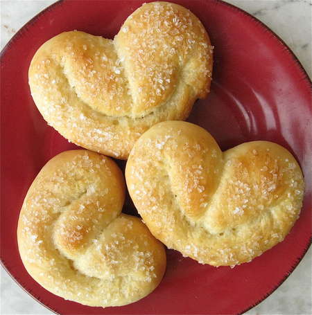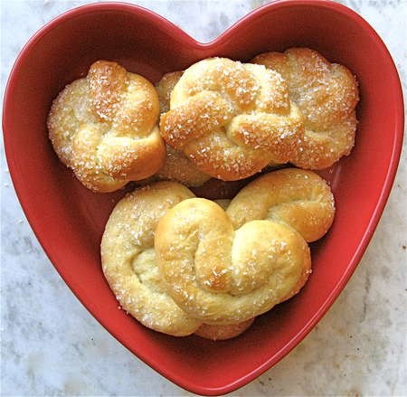 And on a recent Sunday morning, while contemplating heart buns for Valentine’s Day, I remembered this recipe. Lemon heart buns with strawberry jam—yeah! I quickly imagined a simple way to shape yeast dough into a heart, which reminded me of shaping pretzels, which turned my mind to (garlic) knots, from which were quickly born Lemon Love Knots. And Tart Hearts.