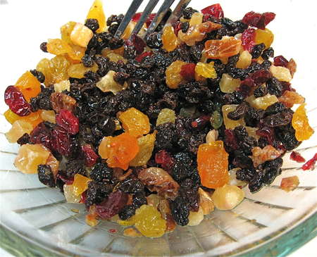 I like to use tiny, sweet dried currants; and our fruitcake blend, which combines diced apricots, pineapple, cranberries, raisins, and dates. Non-traditional, for sure, but oh-so-tasty. Combine the fruit with rum (or apple juice), cover with plastic wrap, and microwave for a minute or so, just to heat it up. Remove from the heat, and let it cool to room temperature. As it cools, it should absorb most of the liquid.