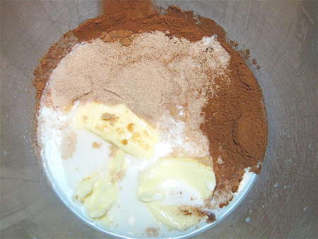 I decided to follow this recipe’s original directions by combining everything except the flour — butter, milk, eggs, yeast, sugar, spices, salt, and baking powder.