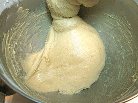 An additional 4 minutes of kneading with the dough hook turned it into a sticky, fairly smooth dough.