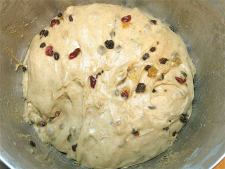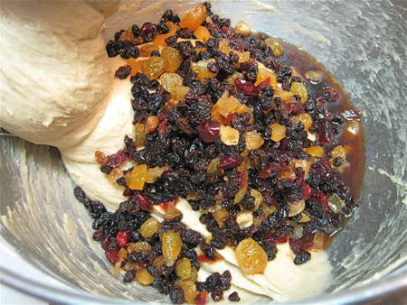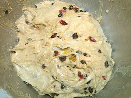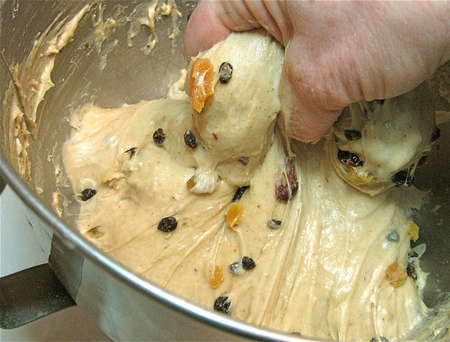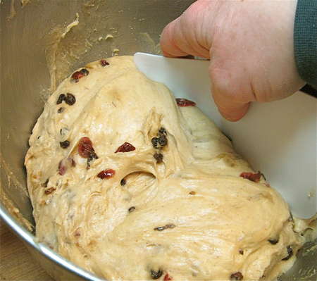 Keep at it till the fruit is well distributed throughout the dough. Cover the bowl, and let the dough rise for 1 hour.
