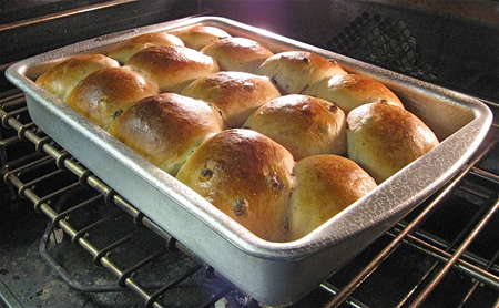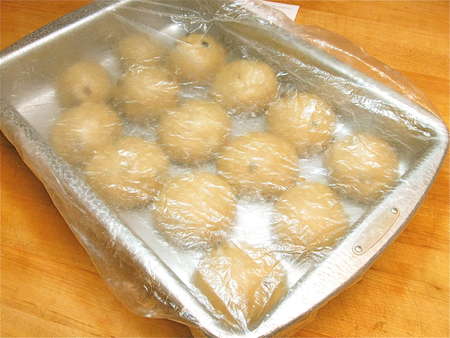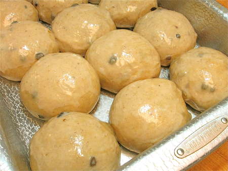 Cover the pan; a plastic shower cap works nicely. Let the buns rise for 1 hour, or until they’ve expanded and started to crowd one another.