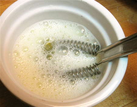 Next, whisk up a mixture of egg white and milk; this will give the buns a satiny shine.