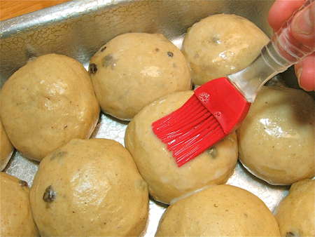 Apply to the risen buns; a silicone brush does a nice, gentle job.
